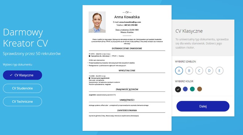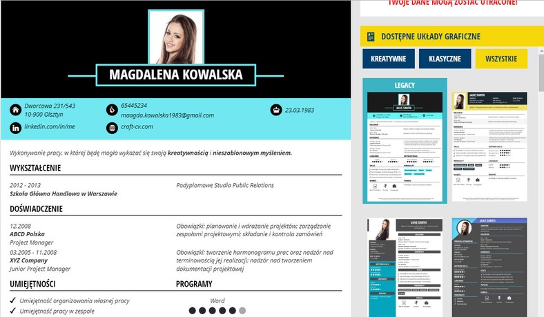 Un créateur de CV polonais gratuit très populaire appartenant à un site Web bien connu avec des offres d’emploi. Contient 10 modèles de forme traditionnelle, mais très esthétiques et d’aspect professionnel. Il vous permet d’enregistrer votre CV aux formats PDF et DOC. Après avoir cliqué sur Créez votre CV nous sommes redirigés vers la première étape de l’assistant, c’est-à-dire choisir un modèle. Ensuite, afin de pouvoir saisir des données dans le CV, nous devons saisir notre adresse e-mail et nous connecter au site Web. Si nous avons déjà envoyé notre CV via Pracuj.pl en réponse à des offres d’emploi, nos données seront automatiquement saisies dans le CV, il nous suffit de le compléter. La dernière étape consiste à télécharger votre CV et à l’enregistrer sur notre profil Pracuj.pl.